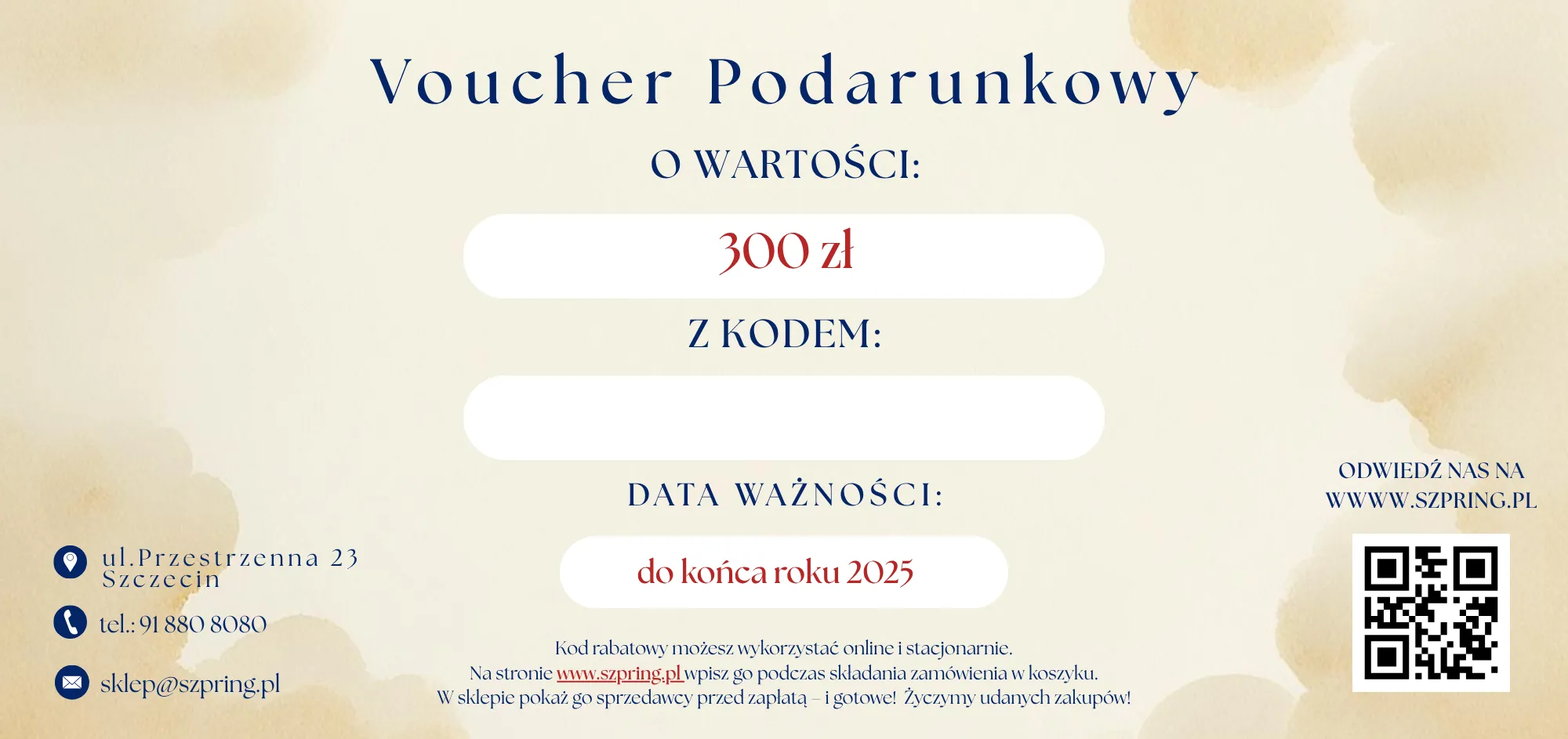 Szukasz prezentu, który zawsze trafia w gust? Bon podarunkowy o wartości 300 zł do sklepu Szpring to sprawdzony sposób na udaną niespodziankę. Można go wykorzystać zarówno online, jak i w naszym sklepie stacjonarnym w Szczecinie.