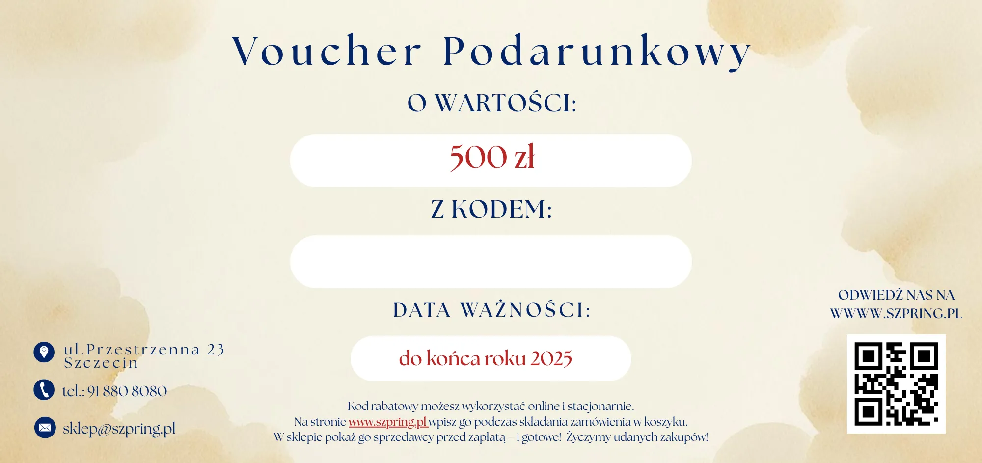 Szukasz prezentu, który zawsze trafia w gust? Bon podarunkowy o wartości 500 zł do sklepu Szpring to sprawdzony sposób na udaną niespodziankę. Można go wykorzystać zarówno online, jak i w naszym sklepie stacjonarnym w Szczecinie.