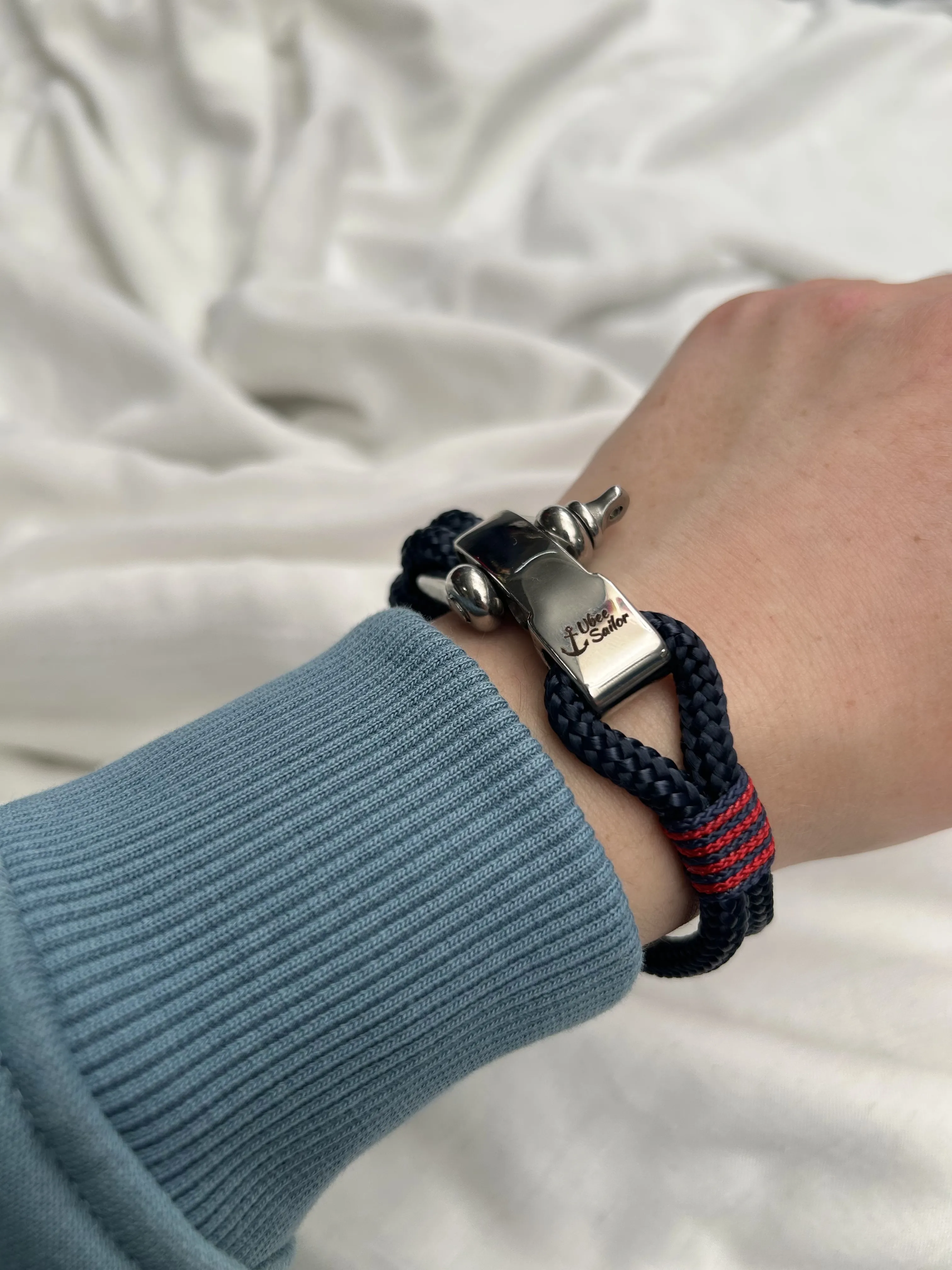 Bransoletka z liny żeglarskiej Ubeesailor łączy prostotę i styl marynistyczny. Wykonana z wytrzymałej liny żeglarskiej i zakończona stalową szeklą, stanowi elegancki dodatek inspirowany morzem. Ręcznie wykonana, unikatowa, odporna na codzienne użytkowanie. Długość 16 cm, kolor granat z czerwonym akcentem.