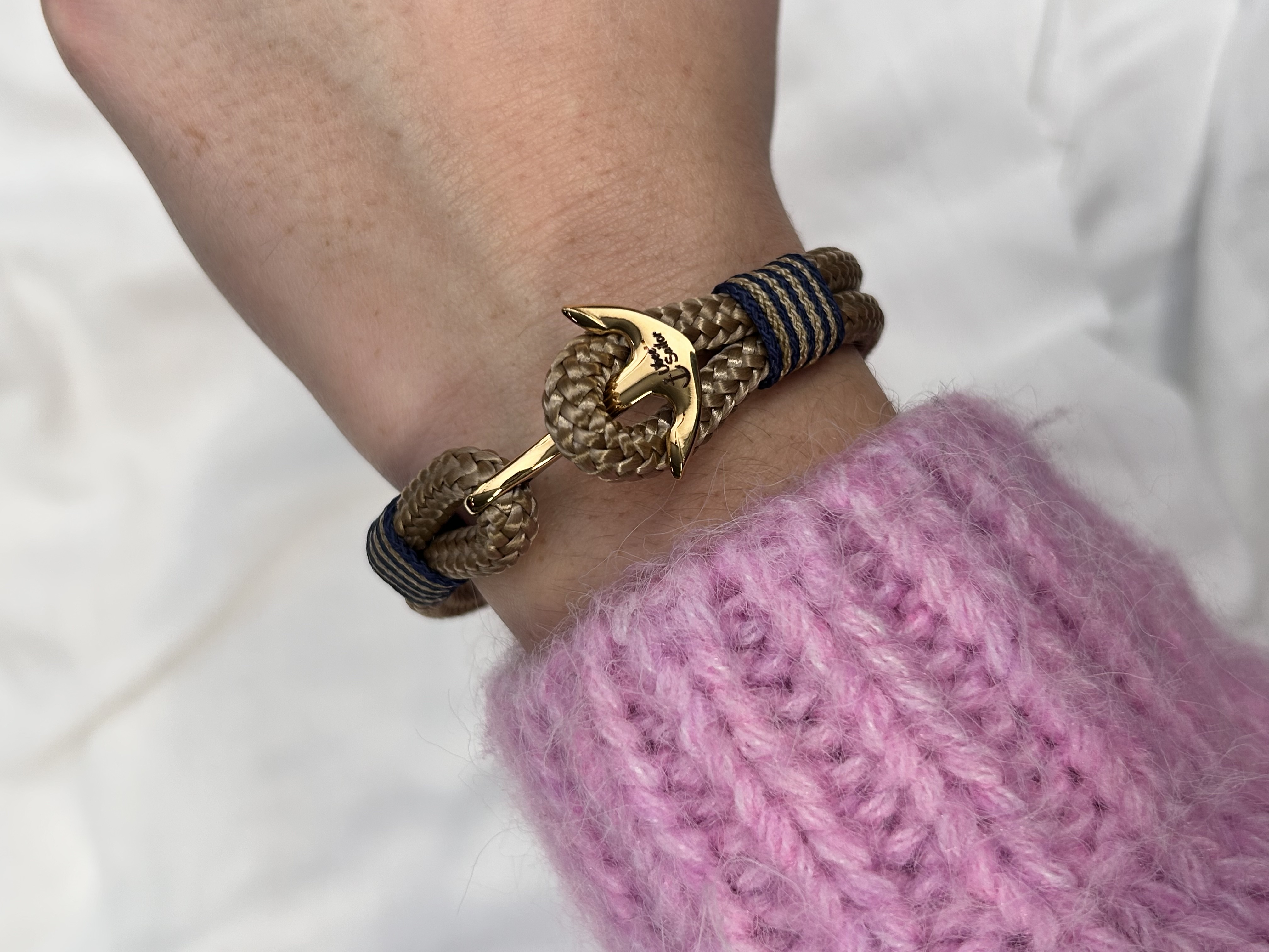 Bransoletka Ubeesailor z liny żeglarskiej w kolorze beżowym oraz kotwicą w kolorze złotym to połączenie stylu i funkcjonalności. Ręcznie wykonana w Polsce, trwała i wygodna.