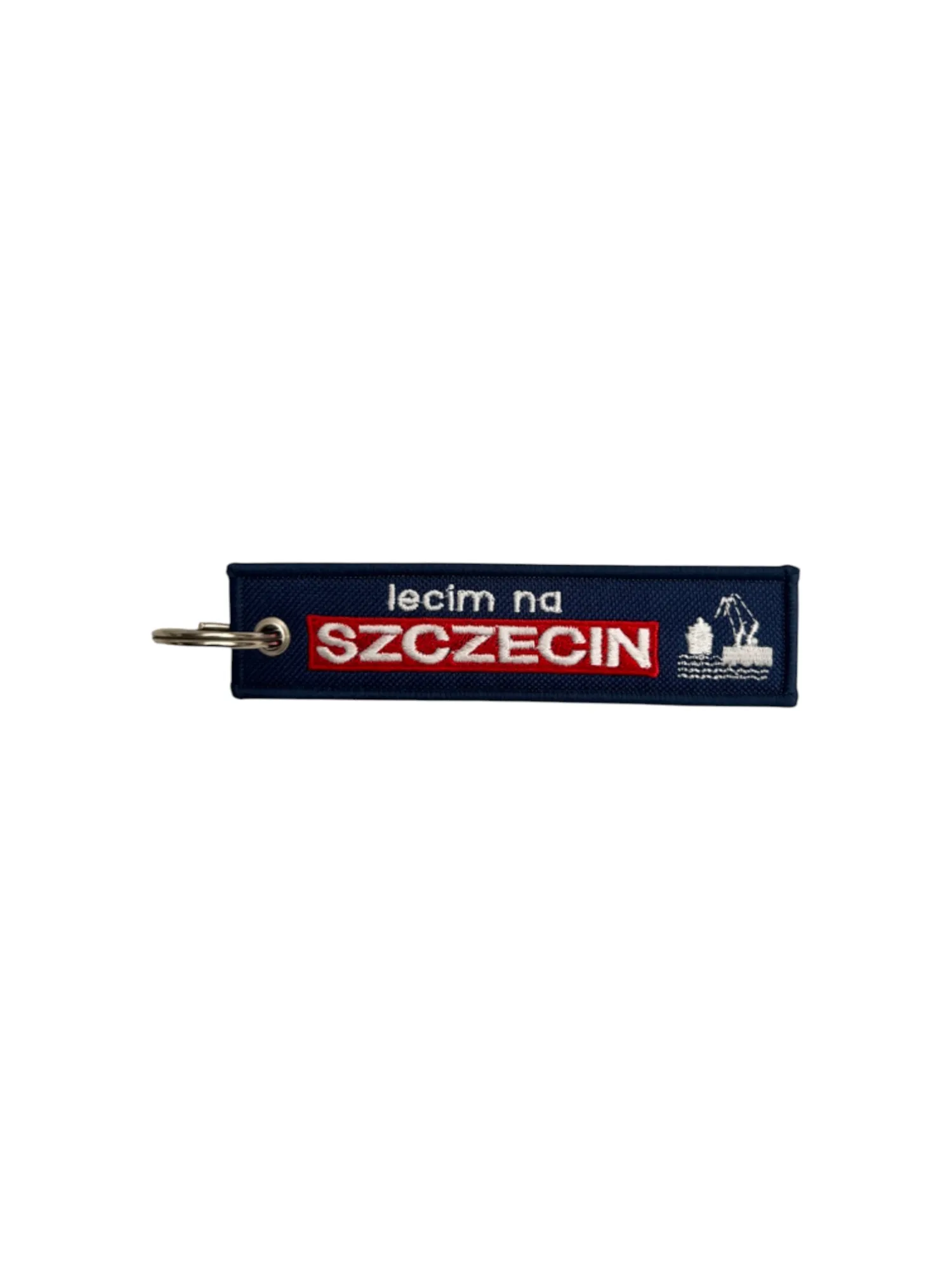 Granatowy haftowany materiał w połączeniu z biało-czerwonymi detalami nadaje brelokowi marynistyczny charakter. To nie tylko praktyczny gadżet, ale i wyraz lokalnej dumy – idealny jako pamiątka ze Szczecina lub prezent dla miłośnika żeglarstwa i morskiego stylu.