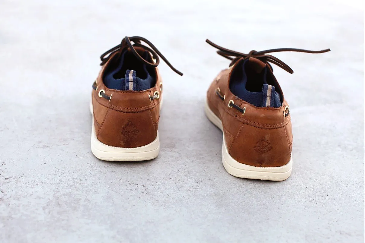 Cholewka wykonana jest z wysokiej jakości skóry pull-up Cyclon (2 mm) – mocno naoliwionej i woskowanej, co czyni ją odporną na wodę morską i intensywne użytkowanie. Dzianinowe wejście oraz klasyczna mokasynowa konstrukcja gwarantują wygodę i dopasowanie, a skórzane sznurowadła z wiązaniem 360° dbają o stabilne trzymanie stopy.