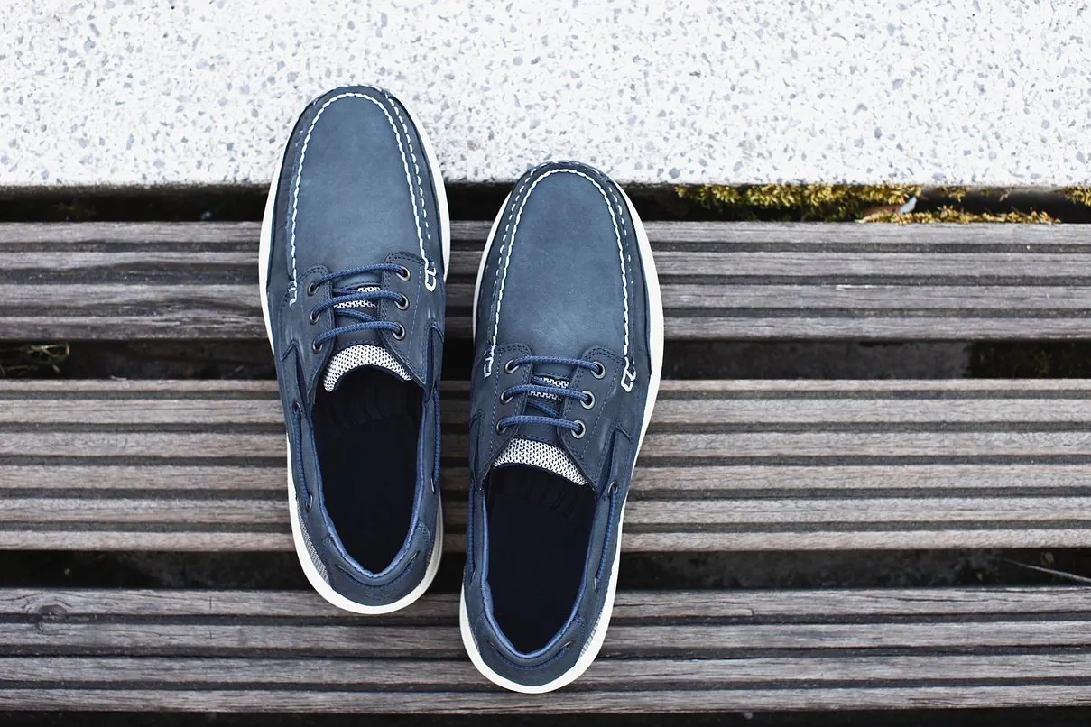 Buty żeglarskie granatowe Blueport Atlantic – 3 Eye Crazy4Sailing to klasyka marynistycznego stylu w nowoczesnym wydaniu. Wykonane z woskowanej skóry nubukowej połączonej z tekstylnymi aplikacjami, łączą elegancję z funkcjonalnością. Ich uniwersalny granatowy kolor świetnie komponuje się zarówno z żeglarskim strojem pokładowym, jak i codziennymi stylizacjami.
