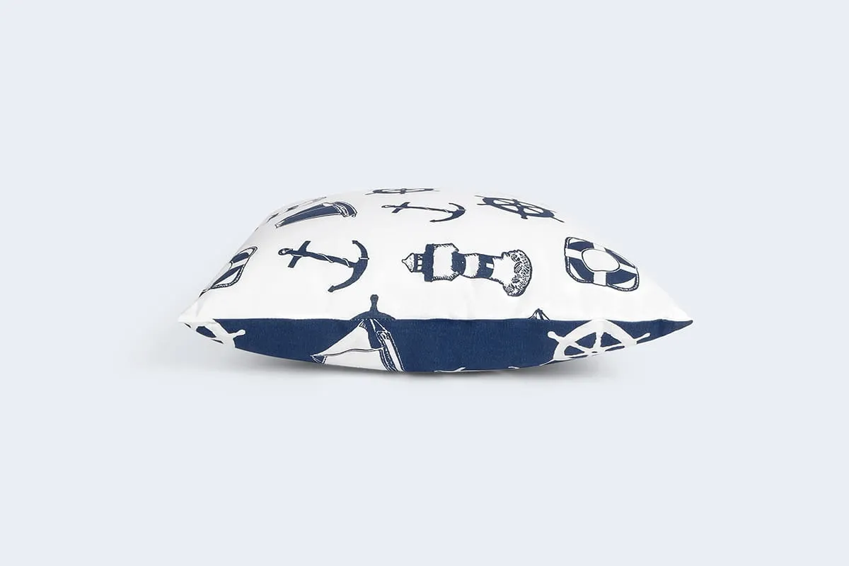 Poduszka marynistyczna ze wzorem w żeglarskie motywy: żaglówki, kotwice, koła ratunkowe, latarnie.