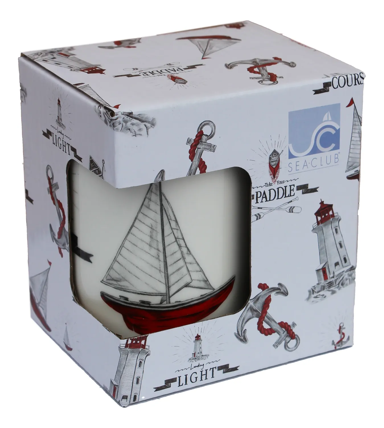 Porcelanowy kubek z czerwonym jachtem w pudełku prezentowym. Styl marynistyczny, idealny prezent dla żeglarza lub miłośnika morza.