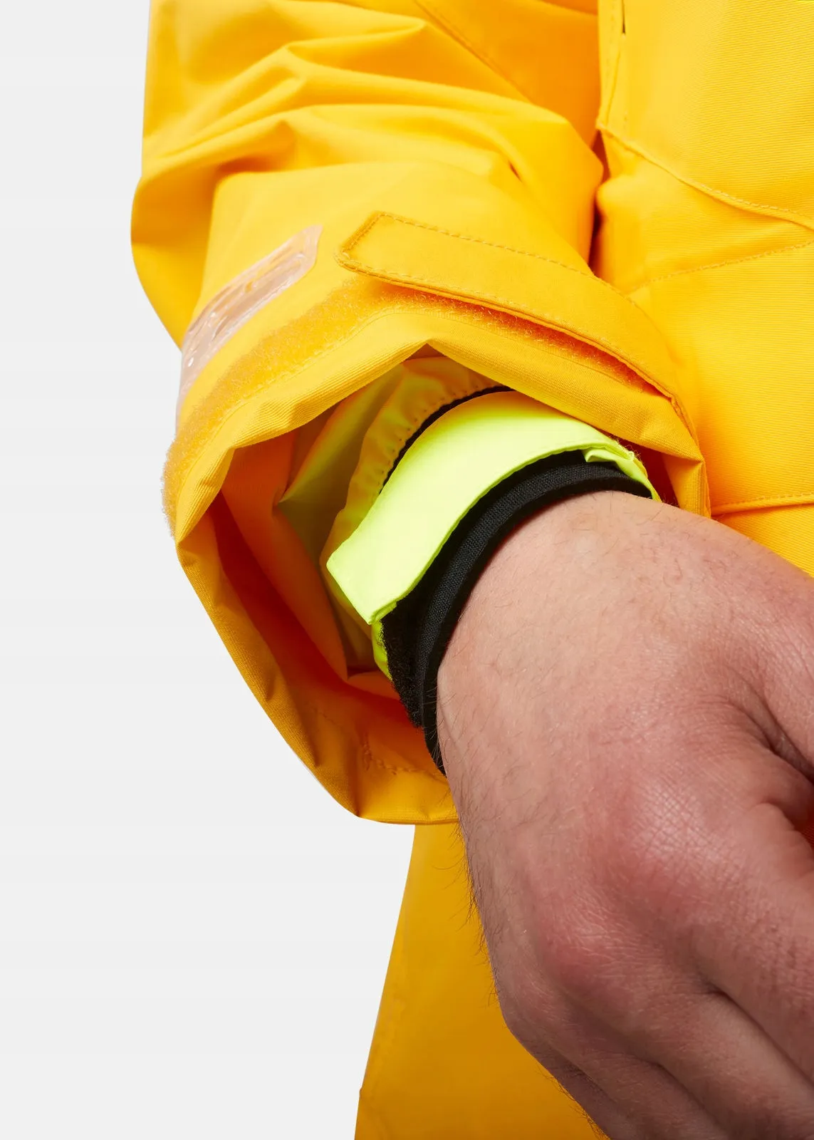 Przemyślana konstrukcja obejmuje wysoki, regulowany kołnierz z maską 3D (z dwoma pozycjami parkowania), neonowy kaptur z daszkiem i kanałem odprowadzającym wodę oraz regulowane mankiety zewnętrzne i neoprenowe wewnętrzne, które tworzą skuteczną barierę przed wodą. Obszerne wzmocnienia w okolicy siedzenia zwiększają trwałość kurtki podczas pracy na mokrym pokładzie.