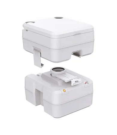 Przenośna toaleta turystyczna wykonana z wysokiej jakości tworzywa ABS, idealna do jachtów i kamperów. Jest trwała i nie wymaga podłączenia do kanalizacji. Posiada zbiornik na czystą wodę o pojemności 13 litrów oraz dolny zbiornik na fekalia o pojemności 20 litrów. Dzięki przemyślanej konstrukcji dostęp do pompki i spłuczki jest możliwy nawet przy zamkniętej klapie. Toaleta wyposażona jest w wygodną deskę klozetową i pokrywę, a spłukiwanie odbywa się za pomocą ręcznej pompki. Wszystkie elementy są szczelne, co zapewnia wysoki poziom higieny. Wbudowany wskaźnik poziomu ścieków zapobiega przepełnieniu, a funkcja uwalniania powietrza chroni przed rozlaniem. Obrotowa wylewka ułatwia opróżnianie zbiornika. Toaleta jest lekka, łatwa w transporcie i gotowa do użycia w dowolnym miejscu. Maksymalna waga użytkownika to 200 kg.